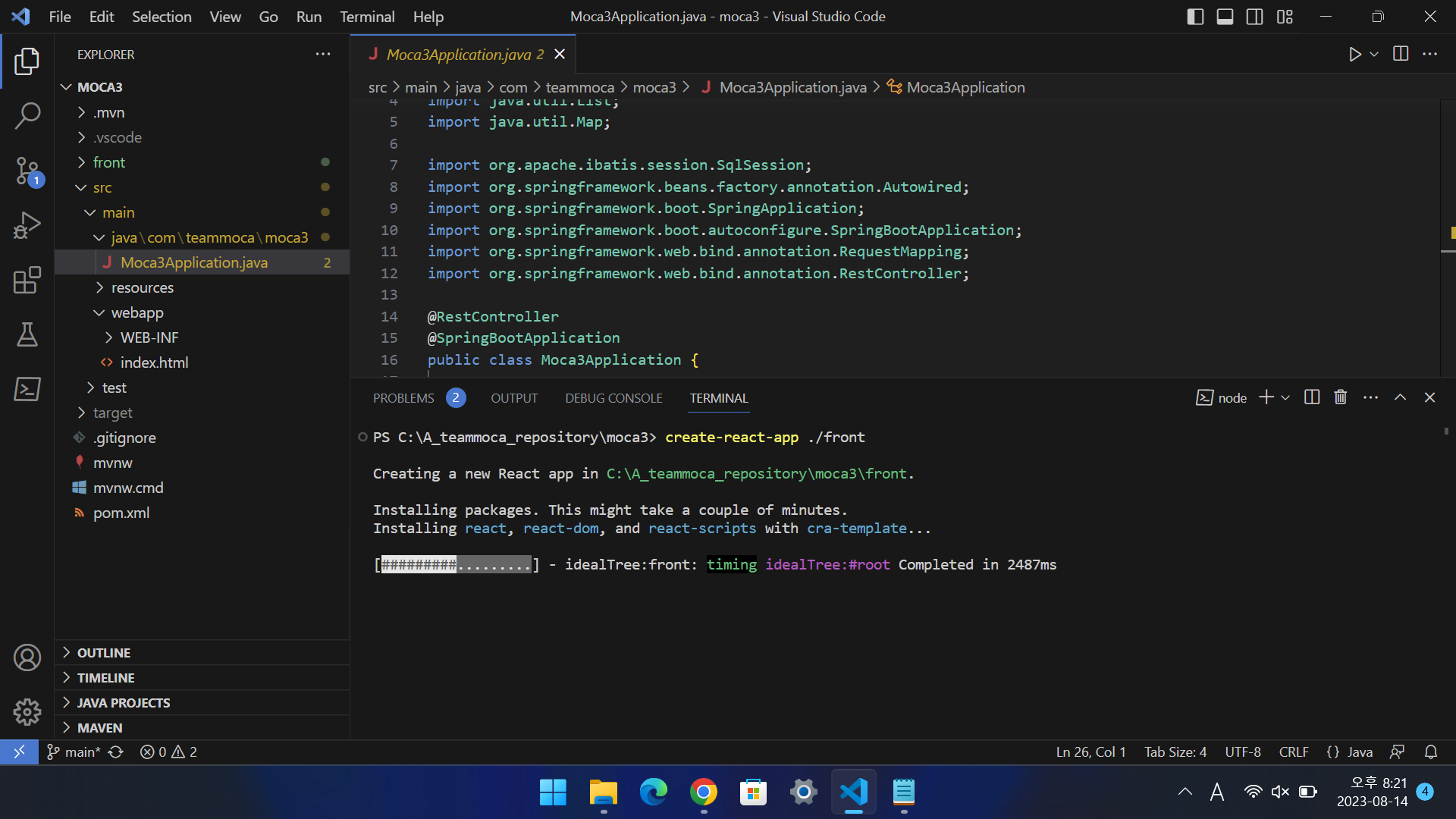 1. Spring Boot 프로젝트폴더에 create-react-app 을 이용하여 react프로젝트를 설치합니다.