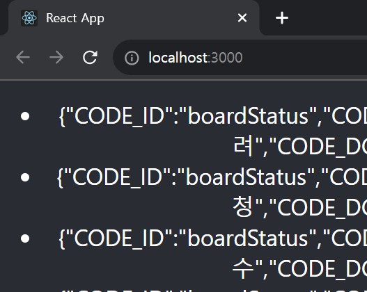 4. App.js에서 통신된 값을 화면상에서 확인 할 수 있게 코드를 아래와 같이 작성합니다.