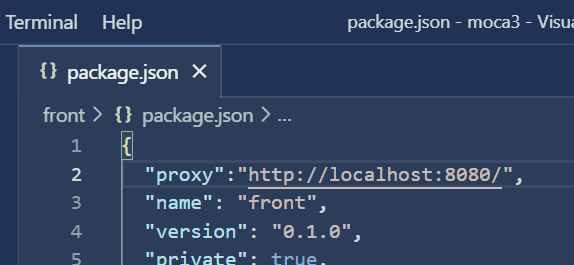 package.json 파일을 열어서 proxy를 설정합니다.