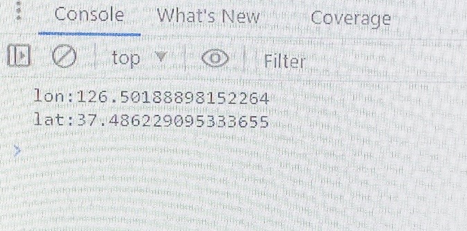 관리자도구창을 열어보면 콘솔에 위도(lat), 경도(lon) 좌표가 찍힌걸 확인하실 수 있습니다