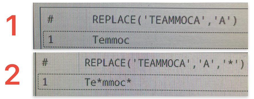 SELECT REPLACE('TeamMoca','a') FROM DUAL;