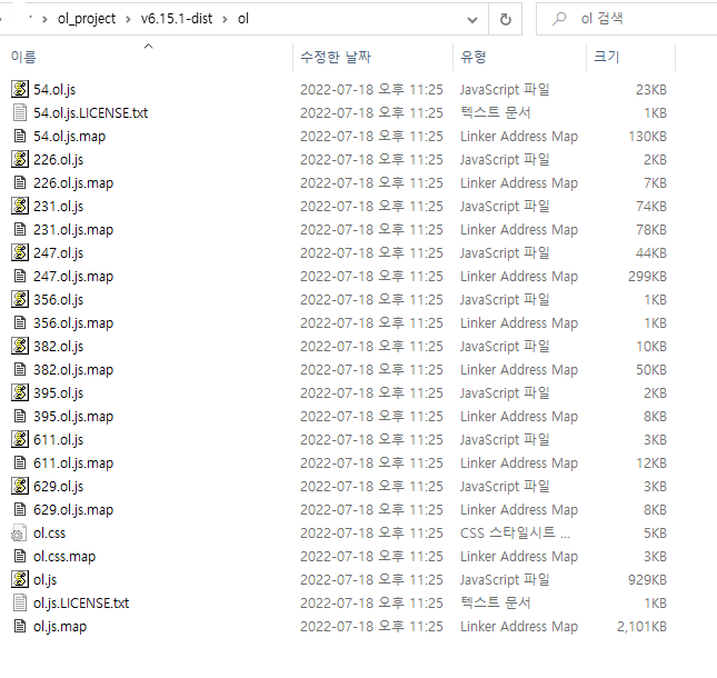 다운로드 하고 압축을 풀면 아래와 같은 파일들이 나오는데 제 포스팅에서는 ol이라는 디렉토리를 하나 생성해서 그 안에 넣어주었습니다.