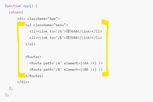 url /A로 접속했을경우 AA.js 화면을 보여주게되며, /B로 접속했을경우 BB.js 화면을 보여주게 됩니다.