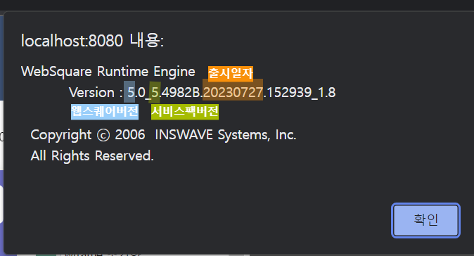 끝으로 웹스퀘어 화면상에서 웹스퀘어 엔진정보를 확인해보고자 한다면 아래와 같이 실행해보시면 됩니다.