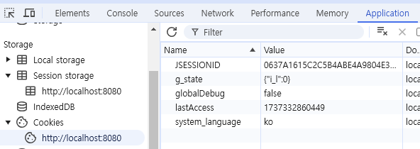 세팅된 쿠키는 Application > Storage > Cookies > 해당도메인 에서 확인할 수있다.